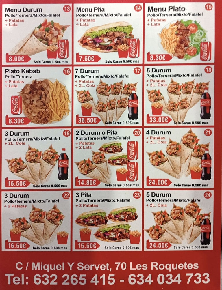 Podrás elegir entre durums y pitas rellenos de pollo, ternera, mixto o falafel, acompañados de verduras frescas, patatas crujientes y una selección de salsas que realzan el sabor de cada plato. También contamos con platos combinados, opciones solo carne, falafel, nuggets y raciones para compartir.